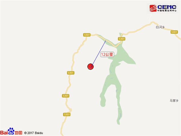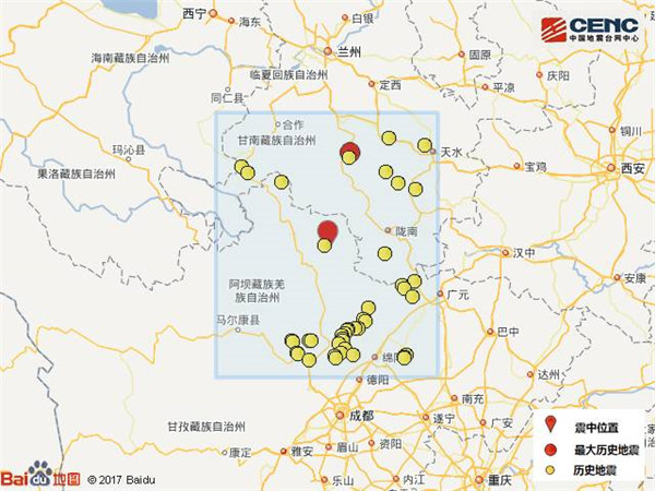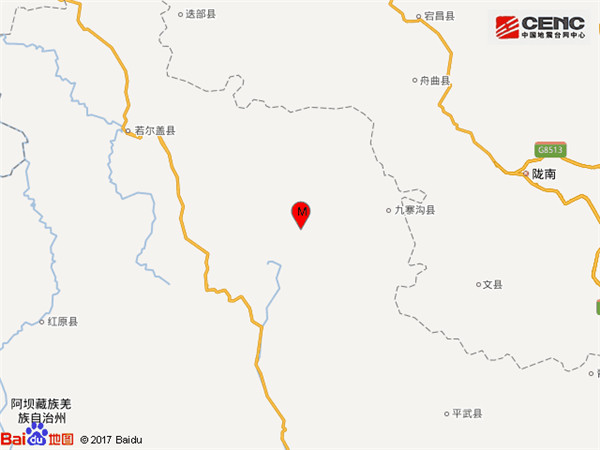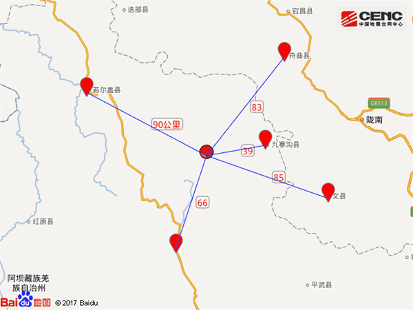 震中距九寨溝縣39公里、距松潘縣66公里、距舟曲縣83公里、距文縣85公里、距若爾蓋縣90公里,距隴南市105公里,距成都市285公里。