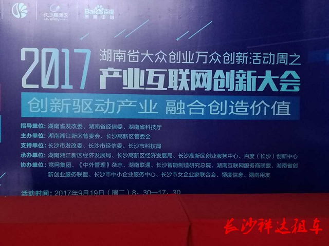 2017年9月19日,由湖南湘江新區(qū)管委會、長沙高新區(qū)管委會主辦,百度(長沙)創(chuàng)新中心等承辦的2017年全國大眾創(chuàng)業(yè)萬眾創(chuàng)新活動周湖南省分會場之產(chǎn)業(yè)互聯(lián)網(wǎng)創(chuàng)新大會,在長沙市舉行。此次會議的嘉賓接送全程由長沙祥達租車提供服務。