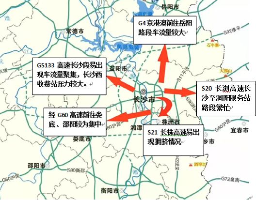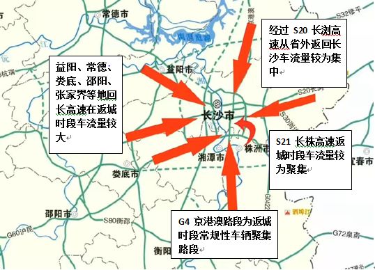 預(yù)計(jì)9月15日返城階段長(zhǎng)沙市周邊流量集中的高速有:G5513長(zhǎng)張高速、S20長(zhǎng)瀏高速、S50長(zhǎng)韶婁高速、G60滬昆高速等。