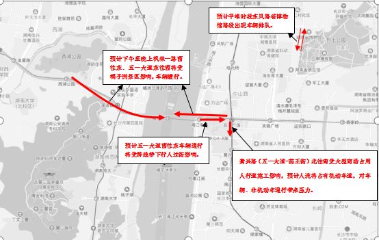 城區(qū)車流量主要以游玩為主,預(yù)計(jì)車流量主要集中在過江通道及熱門景點(diǎn)、商圈周邊道路。例如:白天時(shí)段的楓林一路西往東、東風(fēng)路和潭州大道洋湖濕地公園路段;白天及晚上的黃興中路春天百貨北往南路段;白天至晚上的五一大道東西雙向;下午至凌晨的解放西路等路段。
