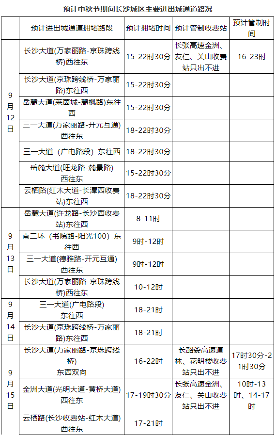 預(yù)計(jì)從節(jié)前一天即9月12日下午14時(shí)開始,長(zhǎng)沙城區(qū)連接周邊高速的出城道路車流量將持續(xù)較長(zhǎng)時(shí)間的增長(zhǎng)。例如:連接長(zhǎng)張高速的岳麓大道、連接長(zhǎng)潭西及長(zhǎng)韶婁高速的云棲路等;9月13日上午10時(shí)30分開始,個(gè)別進(jìn)城道路流量將逐步上升。